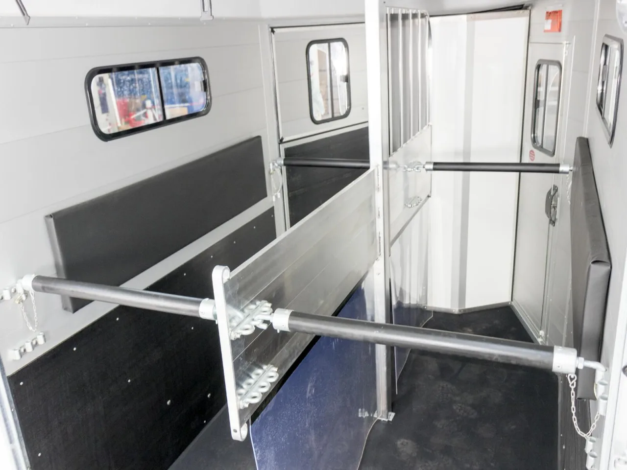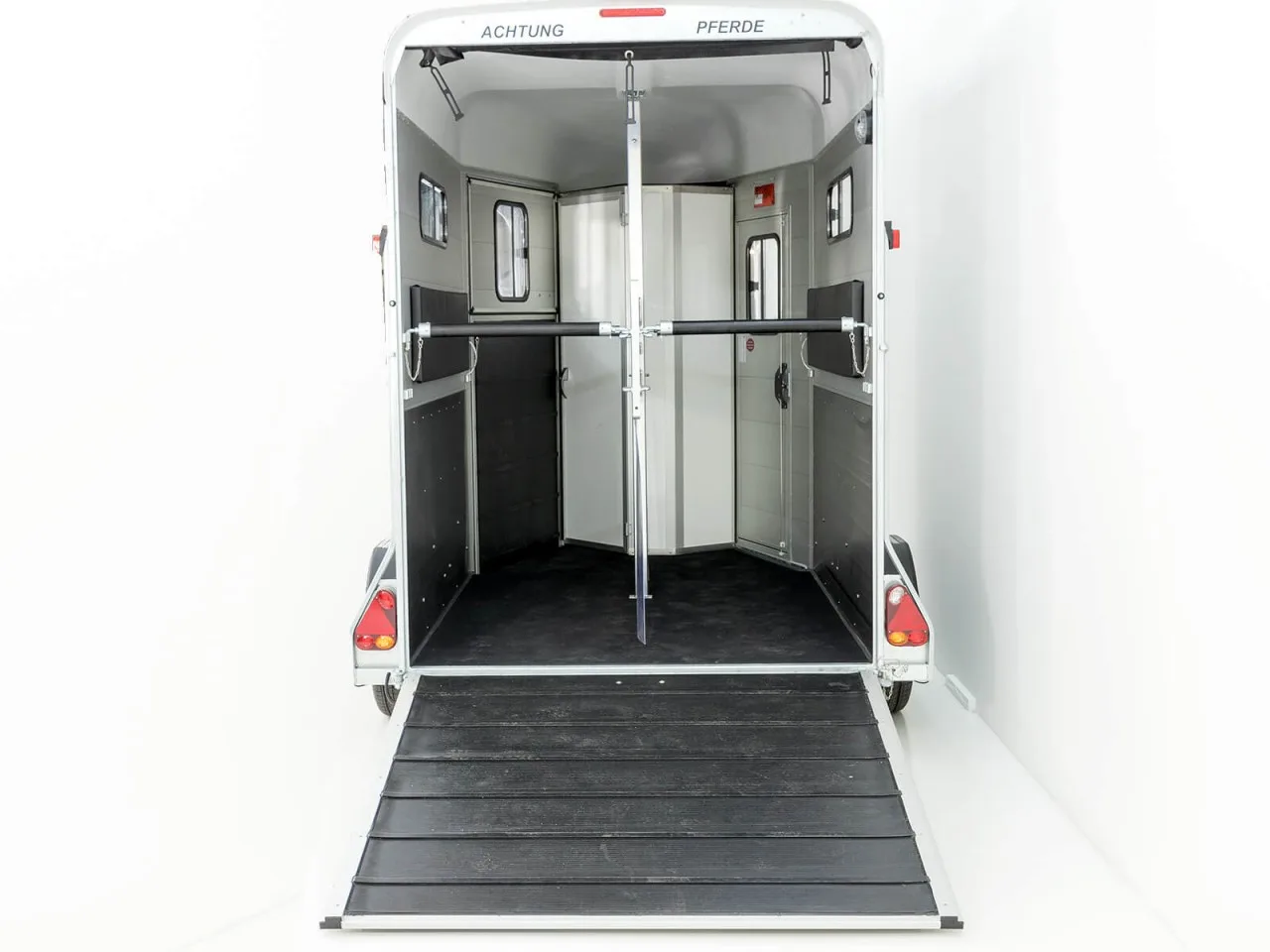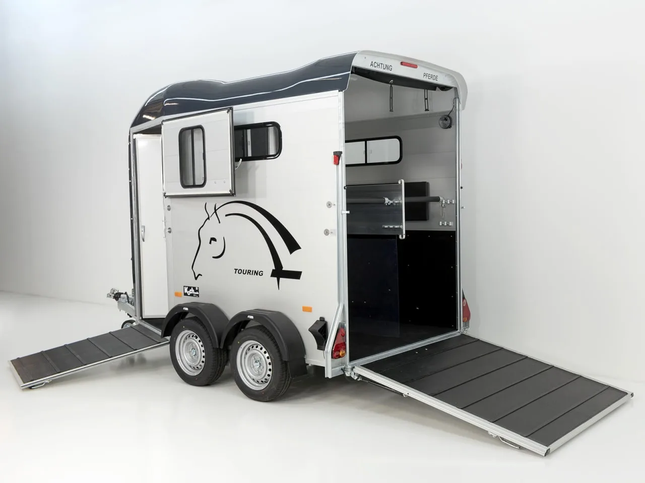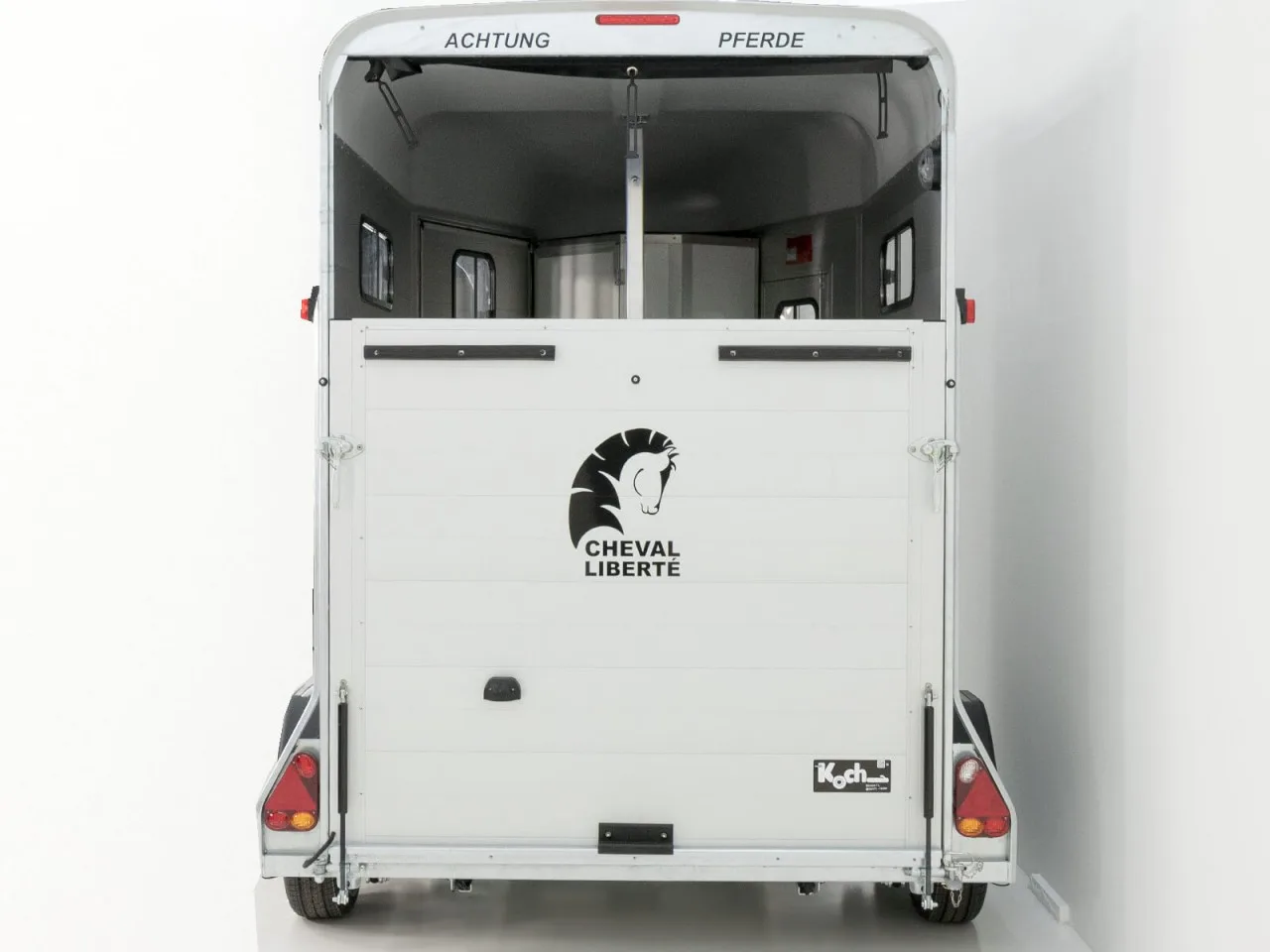 Der Frontausstieg befindet bei dem Anhängerauf der linken Seite. Auf der rechten Frontseite hat Cheval Liberte eine praktische Inspektionstür verbaut. Die Heckklappe ist beim Touring Country Pullman von Cheval Liberte dreh- sowie schwenkbar und somit für den Direkteinstieg und die Beladung mit dem Stapler geeignet. Für den Komfort der Pferde existiert bei dem Modell eine großzügige Fensterklappe. Zusätzlich gibt es mehrere von außen bedienbare Schiebefenster, die zum Schutz der Pferdeaugen mit einem Windabweiser ausgestattet sind. Das licht- und luftdurchlässige Planenrollo, Zurrösen und eine großzügig dimensionierte Sicherheitsbeleuchtung runden den Pferdeanhänger ab.