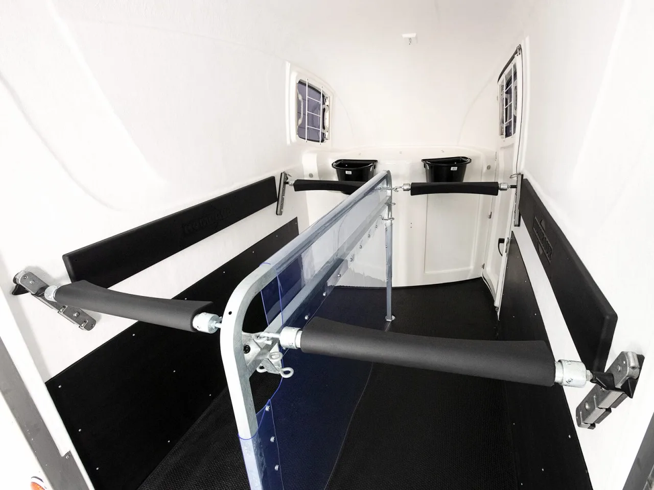 Immer frisch voran: Dank fünffach verstellbarer Frontfenster herrscht im XANTHOS MAXIMUS keine dicke Luft. Für zugfreie Frischluftzufuhr sorgen außerdem ein serienmäßig verbautes Windschott sowie eine auf Wunsch nachgerüstete Dachluke. Doch nicht nur Komfort wird bei Humbaur großgeschrieben: Die verriegelbare Trennwand, Seitenwände aus Vollpoly und ein feuerverzinktes Rahmenprofil machen den XANTHOS MAXIMUS zu einem stabilen und robusten Pferdeanhänger für höchste Ansprüche.