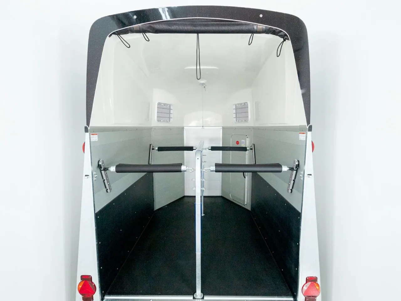 Die komfortable Innenausstattung des Humbaur XANTHOS ist optimal auf die Bedürfnisse von Pferd und Reiter zugeschnitten. Der großzügige Innenraum mit Beleuchtung und zwei Aufstellfenstern sorgt für angenehmes Licht zu jeder Tageszeit. Das zusätzliche Windschott stellt eine zugfreie Frischluftzufuhr im Pferdeanhänger sicher. Und eine durchdachte Sicherheitsausstattung kommt beim deutschen Hersteller Humbaur serienmäßig hinzu: Die gepolsterten Brust- und Heckstangen lassen sich dank Panikentriegelung sekundenschnell von außen lösen. Darüber hinaus schützen die verriegelbare Trennwand und der seitliche Trittschutz das Pferd vor Verletzungen während der Fahrt.
